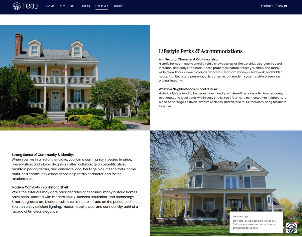 Our Historic Living lifestyle page is designed for buyers who value character, craftsmanship, and established neighborhoods. Instead of blending these homes into standard listings, this page highlights historic and architecturally significant properties in one curated view, focusing on details like original design elements, lot placement, and neighborhood heritage. It attracts buyers searching specifically for historic homes while helping your site rank for niche, high-intent searches and positioning you as an agent who understands the nuances of older homes, preservation considerations, and the lifestyle that comes with living in a historic area.